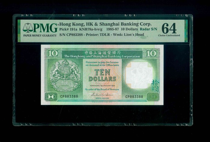 1985 香港上海匯豐銀行$10 PMG 64 編號: CP883388(雷達三對子)
