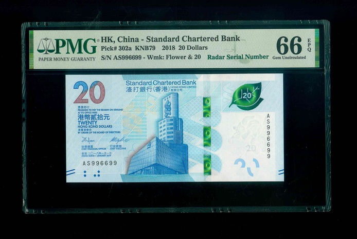 2018 香港渣打銀行$20 PMG 66 EPQ 編號: AS996699(雷達號,頂級雪白)
