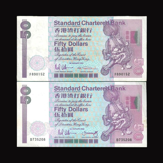 1991/1998 香港渣打銀行 $50 VF 編號:F890152…(共2張)