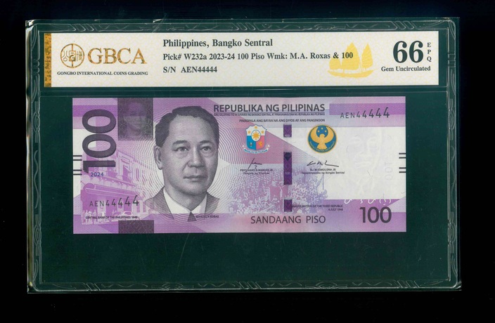 2024 菲律賓 100 Piso GBCA 66 EPQ UNC 編號:AEN44444(幸運全4,頂級雪白)