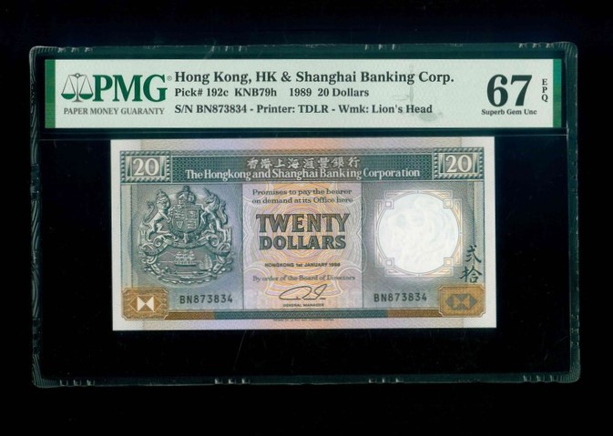 1989 香港上海滙豐銀行 $20 PMG 67 EPQ 編號:BN873834(頂級雪白)