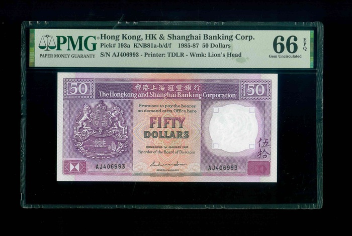1987 香港上海滙豐銀行 $50 PMG 66 EPQ 編號:AJ406993(頂級雪白)