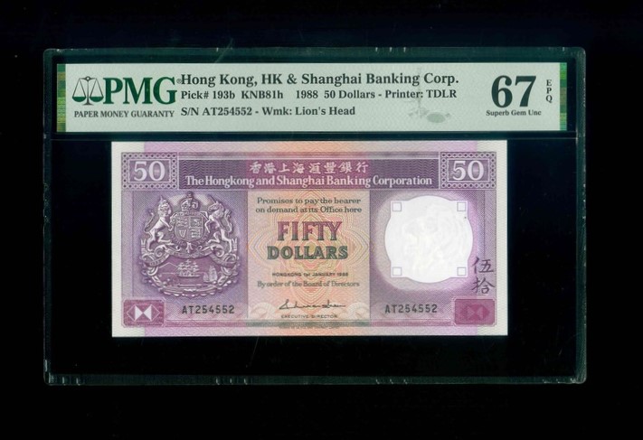 1988 香港上海滙豐銀行 $50 PMG 67 EPQ 編號:AT254552(頂級雪白)