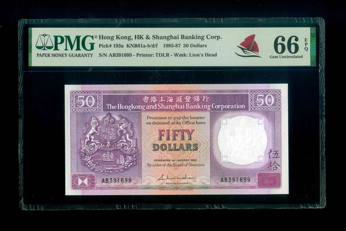 1985 香港上海滙豐銀行 $50 PMG 66 EPQ 編號:AB391699(頂級雪白)