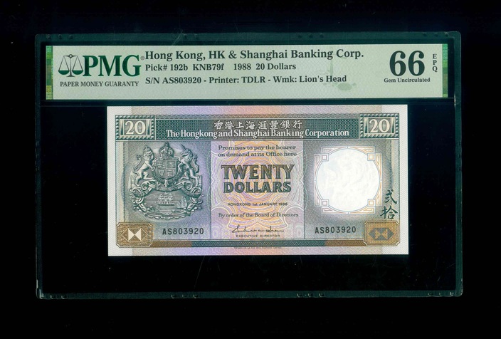 1988 香港上海滙豐銀行 $20 PMG 66 EPQ 編號:AS803920(頂級雪白)