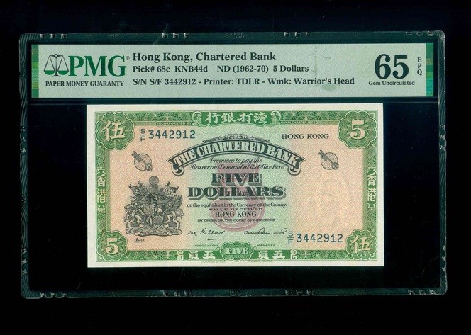 1962-70ND 香港渣打銀行 $5 PMG 65 EPQ 編號:S/F 3442912(頂級雪白,米拿簽名)