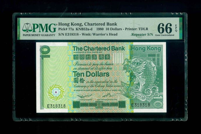 1980 香港渣打銀行 $10 PMG 66 EPQ 編號:E318318(重複號,頂級雪白)