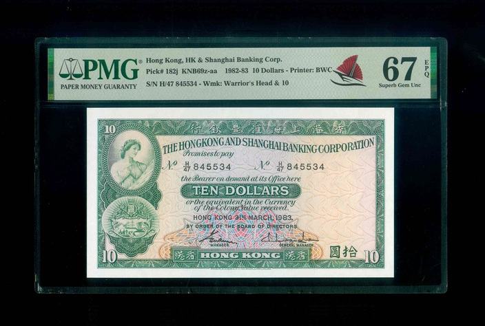 1983 香港上海滙豐銀行 $10 PMG 67 EPQ 編號:H/47 845534(頂級雪白)
