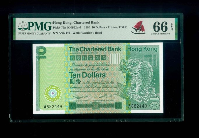 1980 香港渣打銀行 $10 PMG 66 EPQ 編號:A882449(頂級雪白)