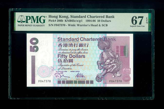 1995 香港渣打銀行 $50 PMG 67 EPQ 編號:F047370(頂級雪白)