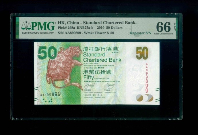 2010 香港渣打銀行 $50 PMG 66 EPQ 編號:AA899899(頭版重複號,頂級雪白)