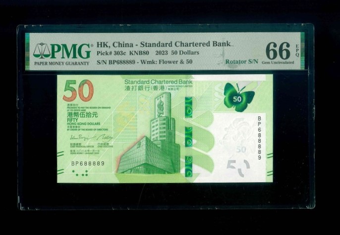 2023 香港渣打銀行 $50 PMG 66 EPQ 編號:BP688889(旋轉號,頂級雪白)
