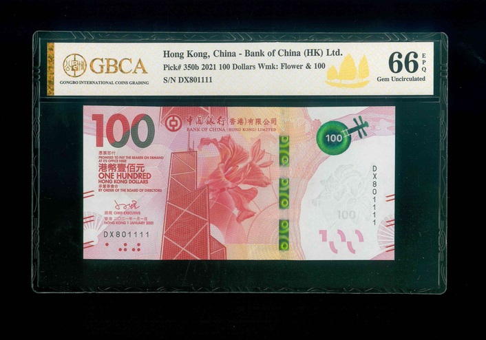 2021 香港中國銀行 $100 GBCA 66 EPQ 編號:DX801111(獅子號,頂級雪白)