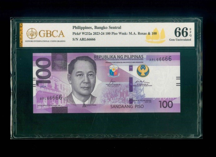 2024 菲律賓 100 Piso GBCA 66 EPQ 編號:ARL66666(幸運全6,頂級雪白)