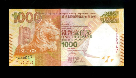 2012 香港上海滙豐銀行 $1000 UNC 編號:CW000047(有微Teller Mark)