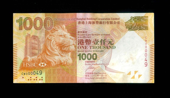 2012 香港上海滙豐銀行 $1000 UNC 編號:CW000049(有微Teller Mark)