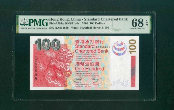2003 香港渣打銀行$100 PMG 68 EPQ 編號: AA855656(高分頭版,頂級雪白)