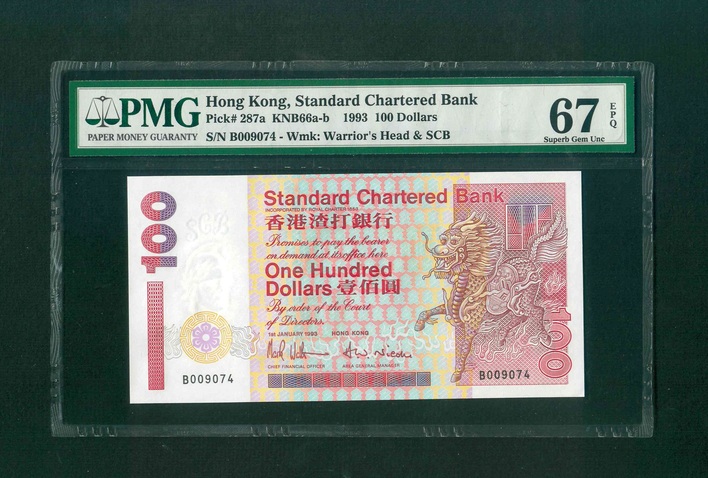 1993 香港渣打銀行$100 PMG 67 EPQ 編號: B009074(頂級雪白)