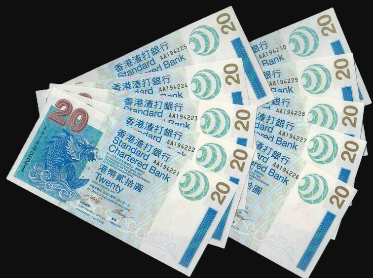 2003 香港渣打銀行$20 UNC 編號: AA194221-230(頭版標準十連,含豹子號,頂級雪白)