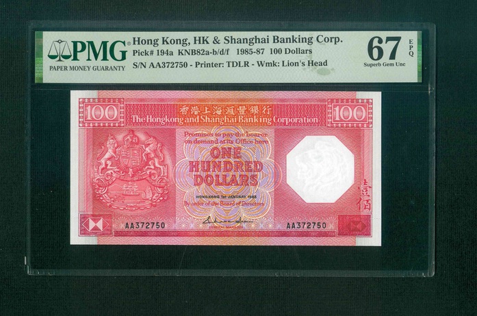 1985 香港上海匯豐銀行$100 PMG 67 EPQ 編號: AA372750(頭版系列,頂級雪白)