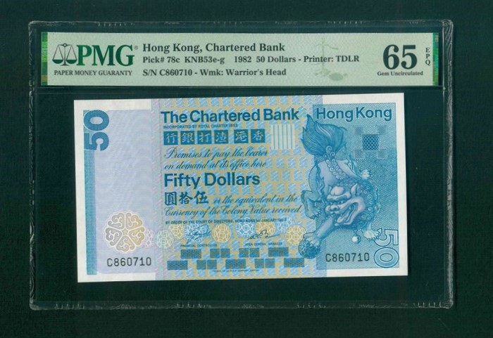 1982 香港渣打銀行 $50 PMG 65 EPQ 編號:C860710(頂級雪白)