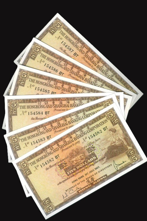 1967 香港上海滙豐銀行 $5 AU 編號:154582-87 BT(共6張,連號)