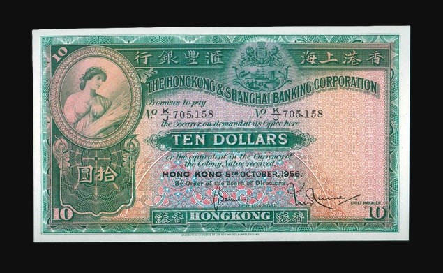 1956 香港上海滙豐銀行 $10 AU 編號:K/J 705158