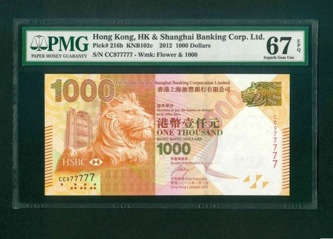 2012 香港上海匯豐銀行$1000 PMG 67 EPQ 編號: CC977777(雙冠老虎號,頂級雪白)