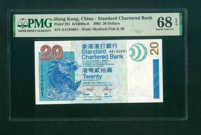 2003 香港渣打銀行$20 PMG 68 EPQ 編號: AA194681(頭版系列,頂級雪白)