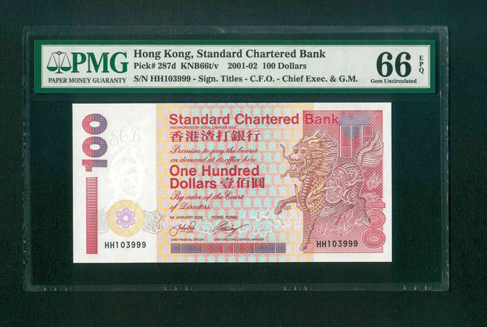 2002 香港渣打銀行$100 PMG 66 EPQ 編號: HH103999(雙冠豹子號,頂級雪白)