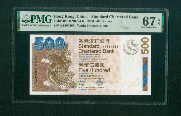 2003 香港上海匯豐銀行$500 PMG 67 EPQ 編號: AA664863(頭版系列,頂級雪白)