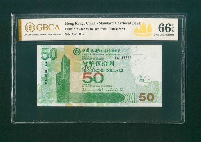 2003 香港中國銀行$50 GBCA 66 EPQ 編號: AA188361(頭版系列,頂級雪白)