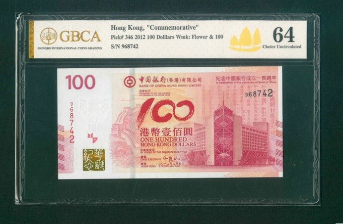 2012 香港中國銀行100周年紀念鈔$100 GBCA 64 編號: 968742