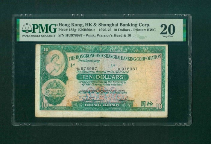 1973 香港上海匯豐銀行$10 PMG 20 編號: HU978987(正面移位,請自行判斷)