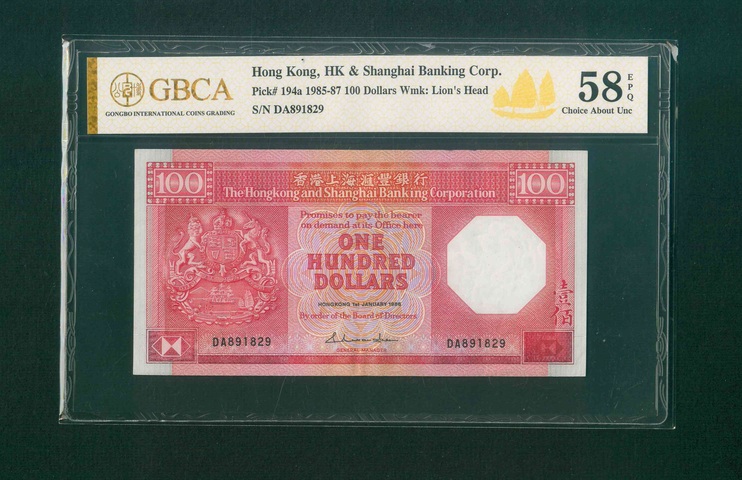1986 香港上海匯豐銀行$100 GBCA 58 EPQ 編號: DA891829