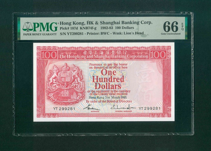 1983 香港上海匯豐銀行$100 PMG 66 EPQ 編號: YT299281(頂級雪白)