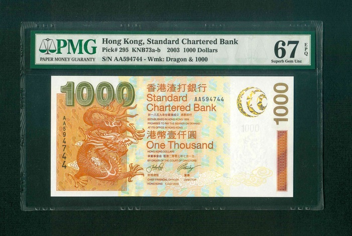 2003 香港上海匯豐銀行$1000 PMG 67 EPQ 編號: AA594744(頭版系列,頂級雪白)