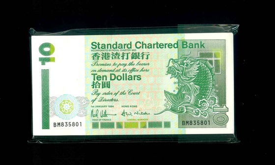 1995 香港渣打銀行$10 UNC 編號: BM835801-900(標準百連,頂級雪白)