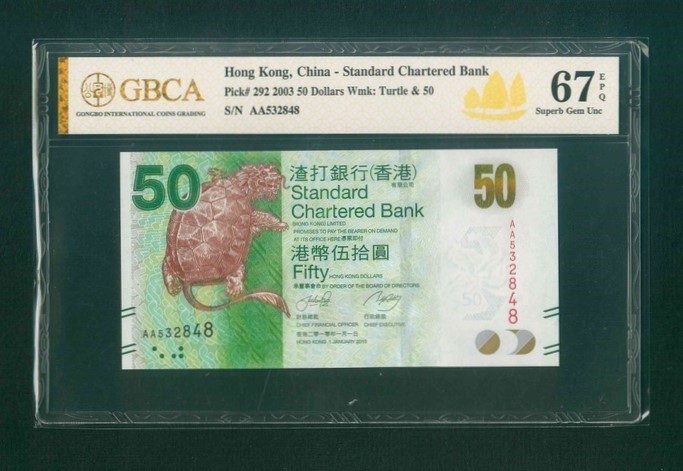 2003 香港渣打銀行$50 GBCA 67 EPQ 編號: AA532848(頭版系列,頂級雪白)