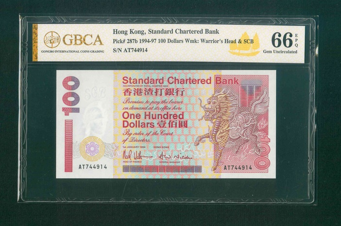1994 香港渣打銀行$100 GBCA 66 EPQ 編號: AT744914(頂級雪白)