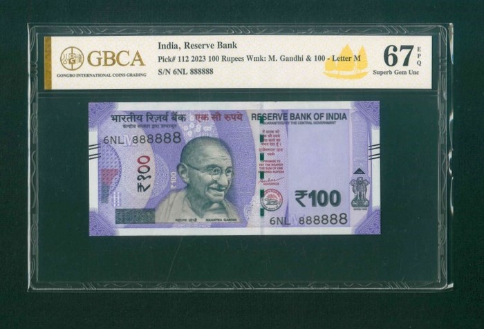 2023 印度 100 Rupees GBCA 67 EPQ 編號: 6NL 888888(全8,頂級雪白)