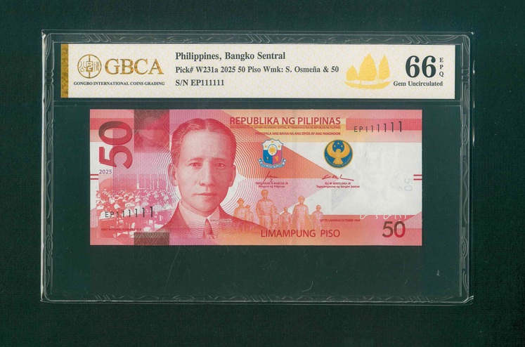 2025 菲律賓 50 Piso GBCA 66 EPQ 編號: EP111111(全1,頂級雪白)