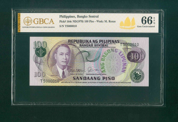1978ND. 菲律賓 100 Piso GBCA 66 EPQ 編號: TS000010(10號,頂級雪白)