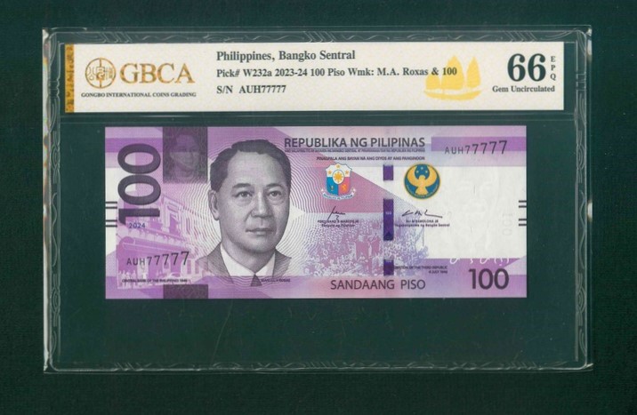 2024 菲律賓 100 Piso GBCA 66 EPQ 編號: AUH77777(全7,頂級雪白)