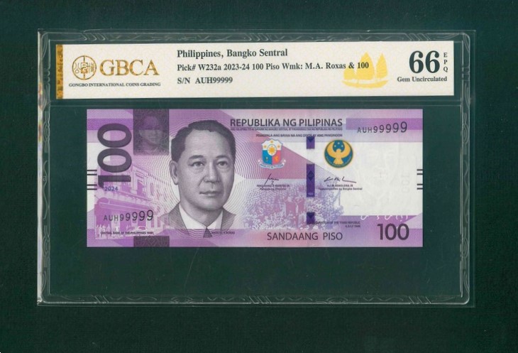 2024 菲律賓 100 Piso GBCA 66 EPQ 編號: AUH99999(全9,頂級雪白)