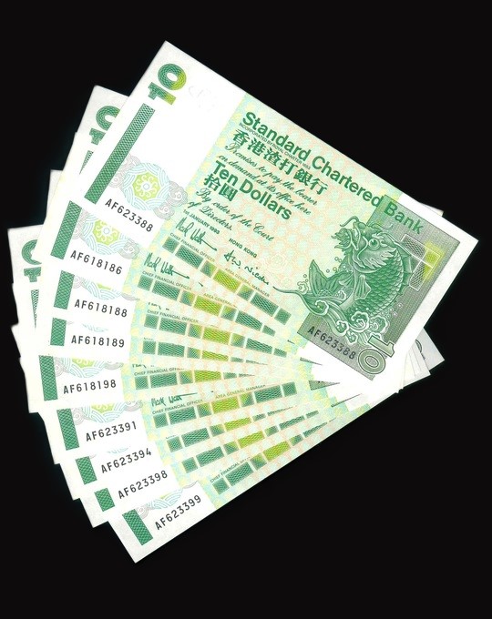 1993 香港渣打銀行 $10 UNC 編號:AF623388…(共9張,含連號)