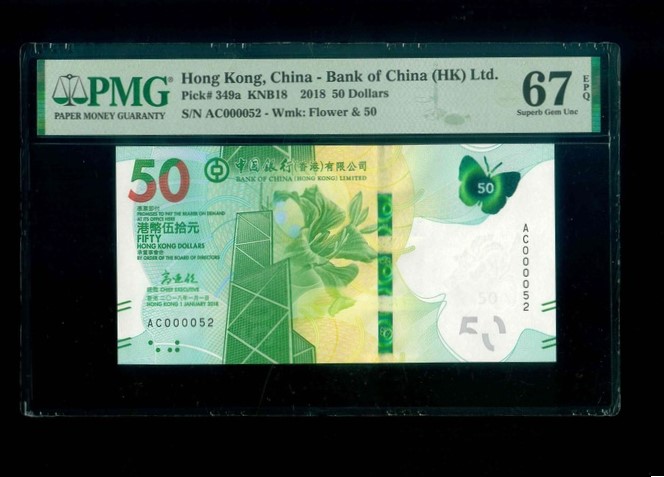2018 香港中國銀行 $50 PMG 67 EPQ 編號:AC000052(細號,頂級雪白)