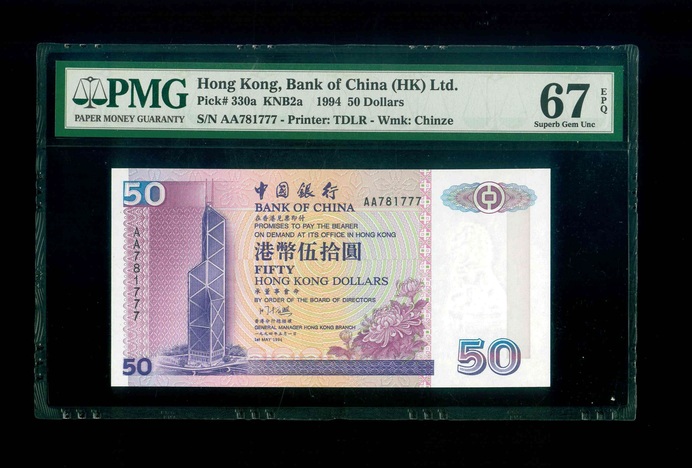 1994 中國銀行 $50 PMG 67 EPQ 編號:AA781777(頭版豹子號)