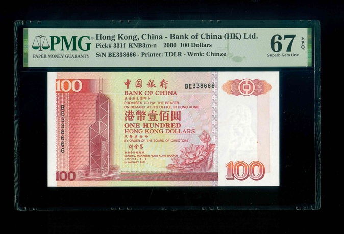 2000 中國銀行 $100 PMG 67 EPQ 編號:BE338666(豹子號,頂級雪白)