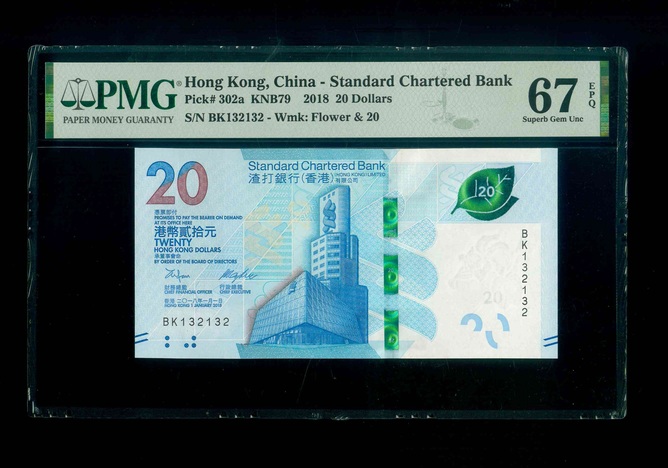 2018 香港渣打銀行 $20 PMG 67 EPQ 編號:BK132132(重複號,頂級雪白)